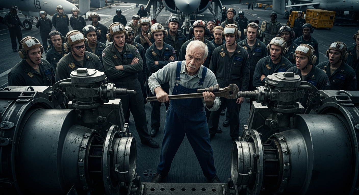 “I spent four years keeping the catapults running on the Kitty Hawk back in the seventies. Before you had fancy tablets and digital sensors, we had to listen to the steel. We had to feel the ship breathe.”