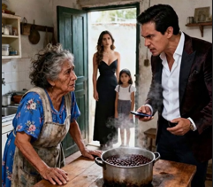 Julián, in einem Samtanzug, konnte seine Empörung nicht verbergen, als er die abblätternden Wände und seine Mutter in einer zerschlissenen Schürze sah.