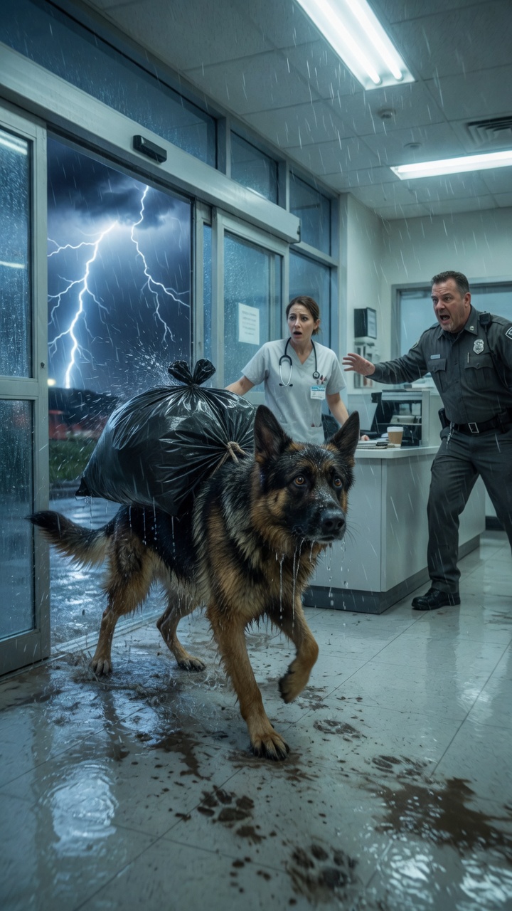 Zuerst wusste niemand, woher es kam. Doch im nächsten Moment öffneten sich die automatischen Türen und ein Hund rannte herein. Es war ein großer Deutscher Schäferhund, völlig durchnässt vom Regen, mit einem schweren schwarzen Müllsack über dem Rücken.